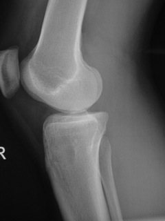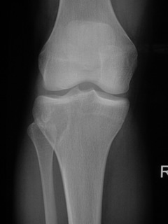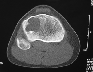 Fig. 1-3: AP and Lateral plain x-rays of a benign fibrous histiocytoma shows an eccentric lytic lesion in the proximal tibia, well- demarcated with a prominent sclerotic rim. No soft tissue mass or trabeculations are seen.