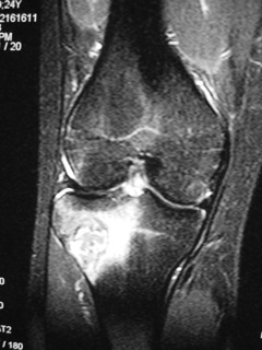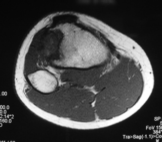 Fig. 4-7: MR imaging of a benign fibrous histiocytoma of the proximal tibia demonstrates a heterogeneous high signal intensity and low signal intensity with surrounding sclerotic bone on T2-weighted images. T1-weighted images show low signal intensity. No soft tissue mass is visible.