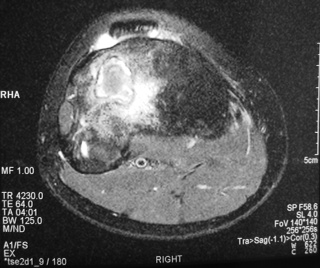 • Heterogeneous high signal intensity with low signal in surrounding sclerotic bone on T2-weighted images