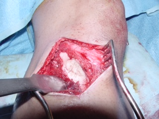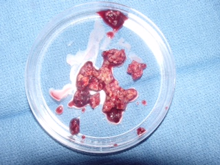 Fig. 8: Gross Pathology of a benign fibrous histiocytoma demonstrates multiple pieces of grayish fibrous tissue.