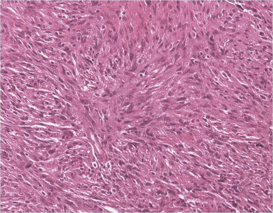 Fig. 9: Microscopic Pathology of a benign fibrous histiocytoma demonstrates abundant fibrous tissue in a storiform pattern distribution. No atypical forms or mitotic figures are distinguished. Lipid laden macrophages can be seen in a BFH (xanthoma cells)