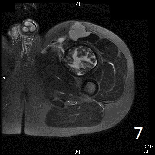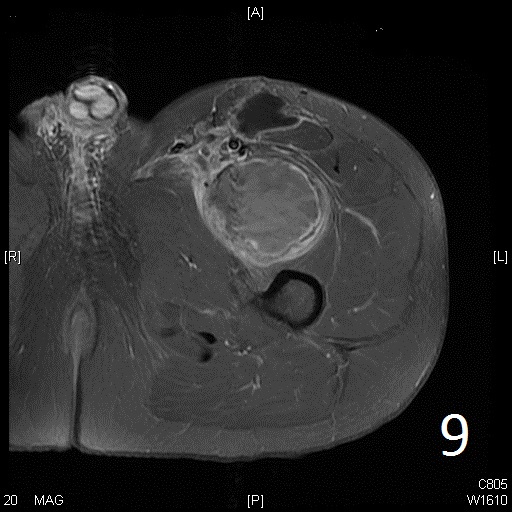 Fig. 5-9: Axial and sagittal (Fig. 6) MRI shows a fibrosarcoma in the proximal quadriceps muscle that is isointense to muscle on T1W images, and a heterogeneous on T2W FS (Fig. 7, 8). The patient was treated with preoperative chemotherapy and the mass underwent extensive necrosis. The mass does not show any enhancement with contrast due to the extensive necrosis. There is only peripheral enhancement with contrast on T1W FS (Fig. 9).