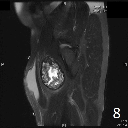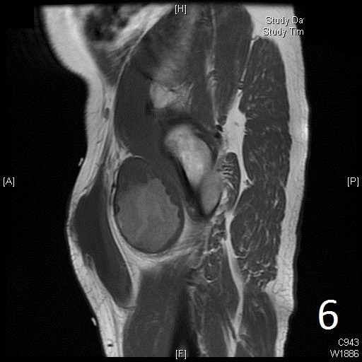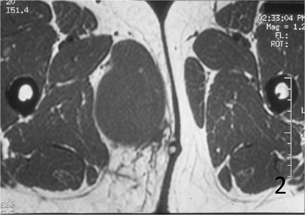Fig. 2-4: An MRI of the thigh shows a mass in the medial compartment that is isointense to muscle on T1W images (Fig. 2) and heterogeneous on T2W (Fig. 3). Sagittal T1W post contrast with gadolinium demonstrates enhancement of the tumor (Fig. 4).