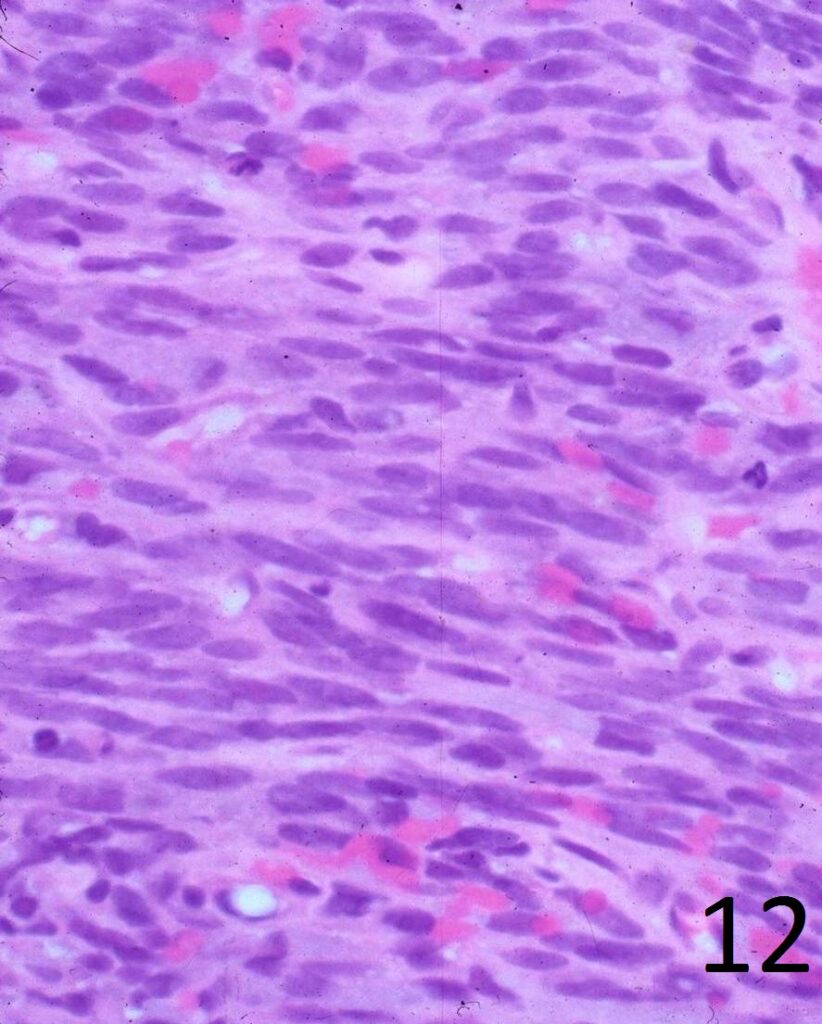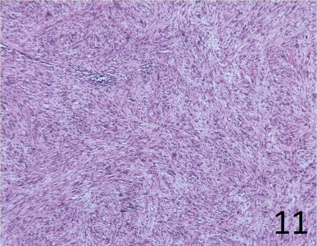 • Elongated, fairly uniform spindle cells with scant cytoplasm in a fibrous stroma