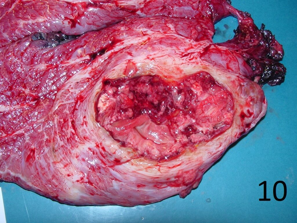• Fleshy, focally necrotic and hemorrhagic mass—>High grade (Grade 2-3) tumors (Fig. 10)