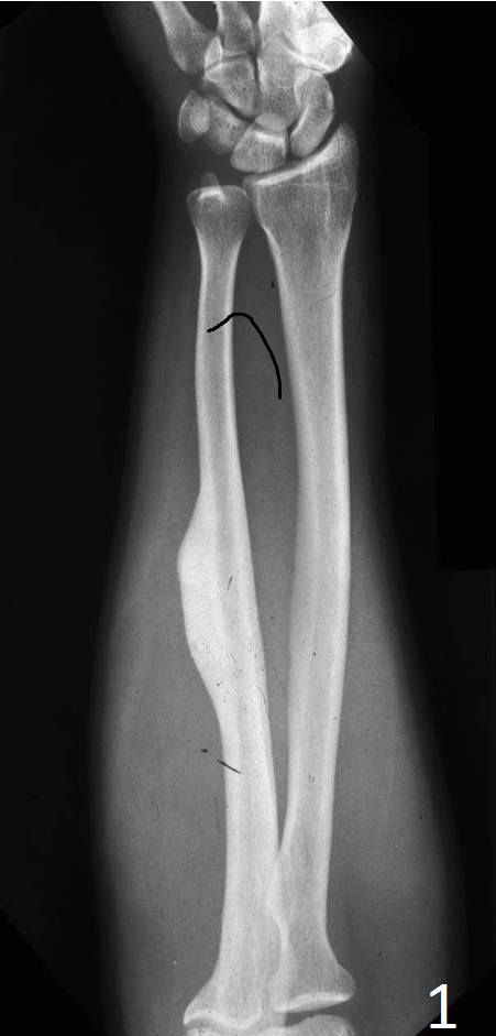 Fig. 1. AP xray of forearm show a superficial bone lesion in the shaft of the ulna consistent with an osteoma.
