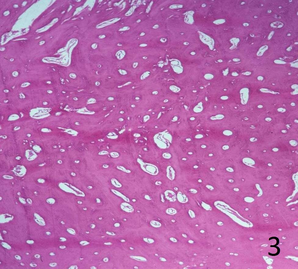 Fig. 3. Low power magnification of lesion, shows a dense thickened lamellar bone with haversian systems.
