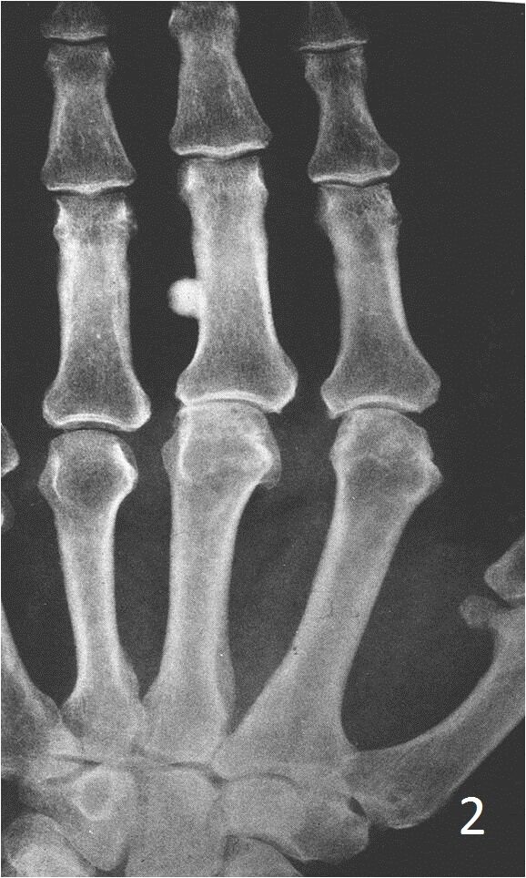 Fig. 2. AP xray of hand show a well circunscribed bone lesion on the 3rd index consistent with a small osteoma.