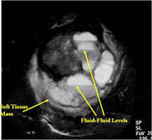 - The cystic spaces filled with hemorrhagic material leads to the presence of fluid-fluid levels on MRIs (so called ABC-like changes or telangiectatic change)