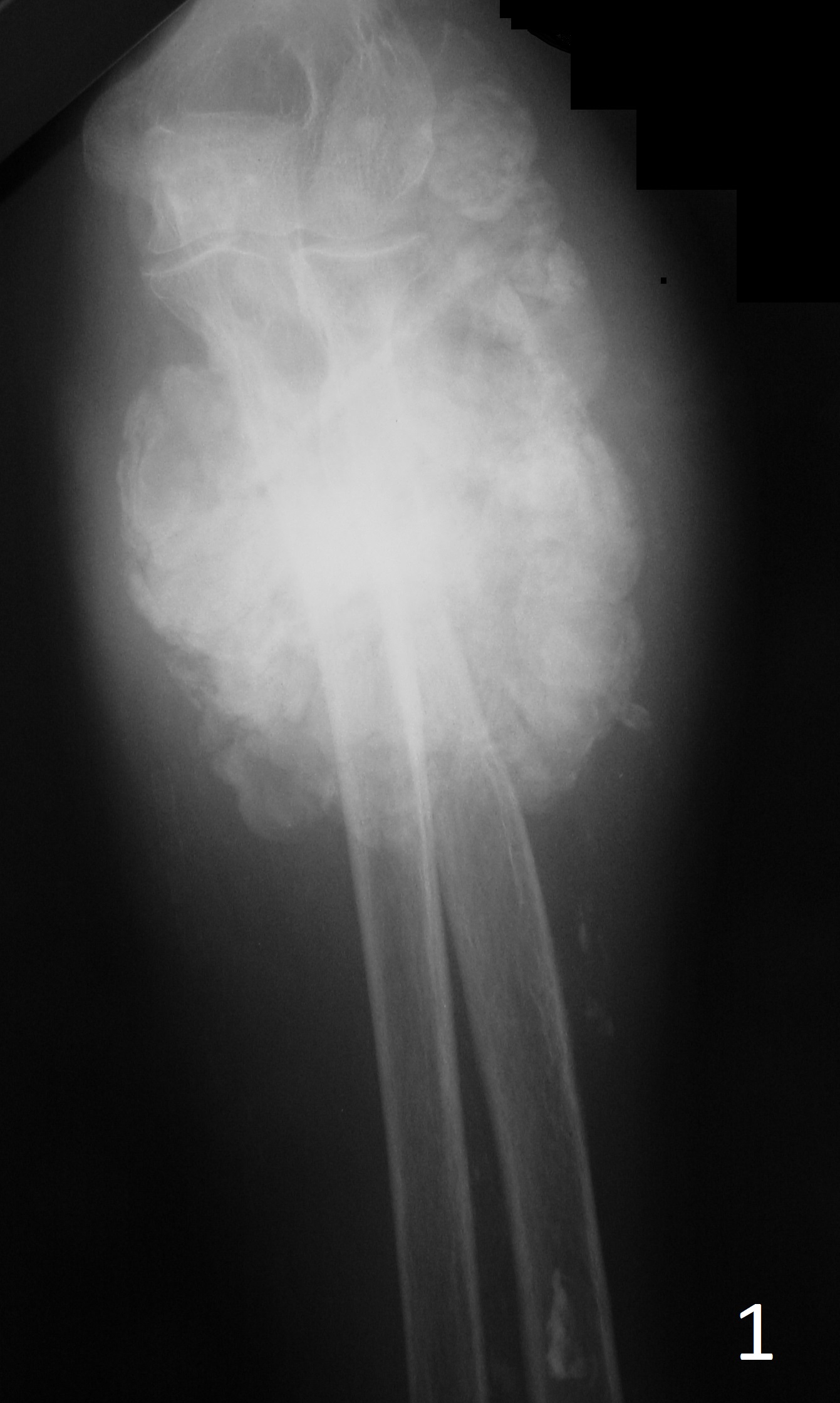 Fig. 1-2: AP (Fig. 1)and lateral (Fig. 2) xray of elbow show exuberant ossification around the elbow joint consistent with tumoral calcinosis in this patient with chronic renal failure.
