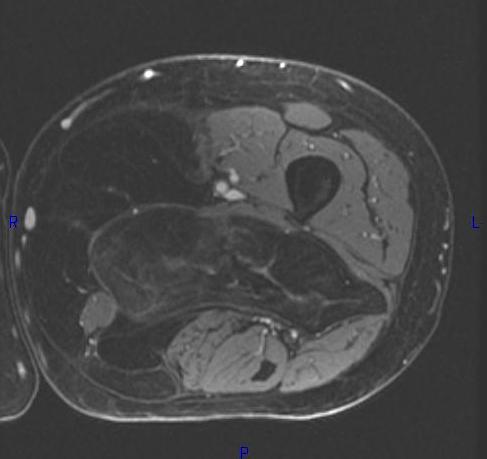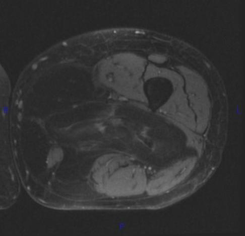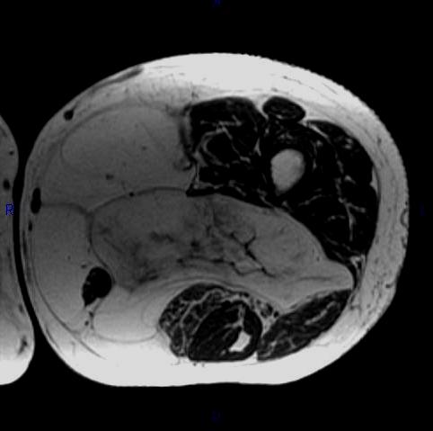 Liposarcoma is one of the most commonly diagnosed soft tissue sarcoma, accounting for approximately 12.8% of all sarcomas. Most patients are older than 50 years of age who complain of a large, painless, deep-seated mass located proximally in the extremities. Liposarcoma is a malignant mesenchymal neoplasm composed of lipogenic tissue with varying degrees of atypia. MRI is nonspecific except for well-differentiated tumors in which fat signal is easily distinguished.